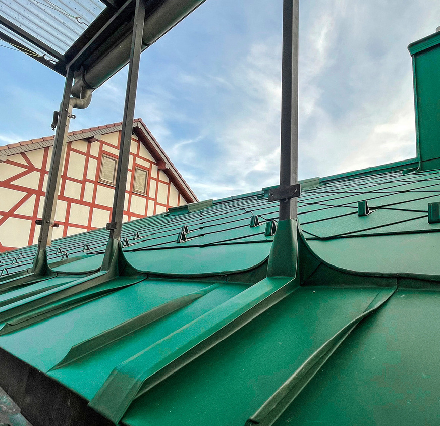 Durch die geografische Nähe zum Sitz des Aluminiumproduktherstellers Prefa in Wasungen und die daraus resultierenden Arbeiten in dessen Umkreis wünscht sich Bickels Kundenstamm häufig Lösungen aus Aluminium. Für den Falzmeister kein Problem. „Falzdetails sind immer eine großartige Herausforderung an einen selbst“, weiß er zu berichten. „Das ist das Schöne an unserem Beruf. Man kann sich immer wieder etwas Neues ausdenken und es danach umsetzen. Natürlich spielen Aspekte wie Ausdehnung oder Wasserlauf auch immer eine wichtige Rolle. Dem Ganzen dann noch eine ansprechende Optik zu verpassen hat etwas sehr Befriedigendes. Es mag vielleicht etwas komisch klingen, aber ich kann bei solchen Arbeiten immer besonders gut abschalten. Ich schaue nur, was das Material macht, und arbeite dann damit.“