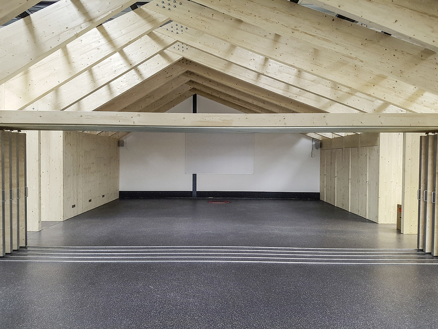 Starkes Dachhandwerk braucht starke ­Fußböden. Hier mit einem integriertem Schienensystem für verschiebbare Wandelemente