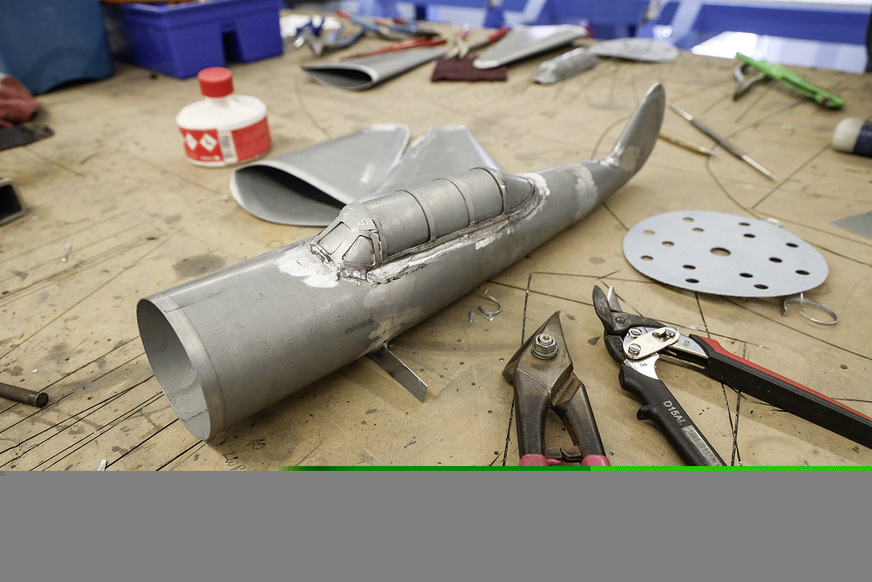 Die Teilnehmer hatten ihre mitgebrachten Werkzeuge vor sich ausgebreitet und legten mit dem vordersten Teil des Rumpfes los. Dieses musste auf ein gedrücktes Rundblech passen, das später den Propeller aufnehmen würde. Rasch zeigte sich, dass es mit Schere und Zange nicht getan war, sondern aufgrund der Formen und Zusammenhänge auf ein breites Repertoire von Tricks und Kniffen zurückgegriffen werden musste, das sich nur mit weiteren Tools ergab.