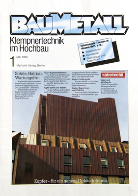 Nun ist es soweit! Mit Erscheinen der vorliegenden Ausgabe 3/2015 darf BAUMETALL endlich an den berüchtigten Ü30-Partys teilnehmen. Was war das toll in den 1980ern! Die Metallfassaden fast aller öffentlichen Gebäude wurden vom Winkelstehfalz dominiert und die Doppelstehfalzdächer gleich quadratkilometerweise montiert. Nach den entbehrungsreichen 70er-Jahren herrschte regelrechte Goldgräberstimmung bei den Klempnern. Auf den folgenden Seiten schildern die BAUMETALL-Anzeigenkunden der ersten Stunde, was sich seither bewegt hat. Dabei zeigen sie auch auf, wohin die Reise gehen kann. Den Anfang machen die KME-Kupferspezialisten aus Osnabrück. Sie hatten im Mai 1985 nebenstehende Titelseite gebucht.