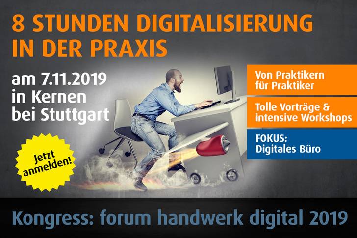 Sichern Sie sich ein Ticket für 89 Euro um an dem eintägigen forum handwerk digital teilzunehmen. Warum? Impulse für mehr Effizienz, das digitale Büro und Onlinemarketing verstehen und direkt in der Praxis umsetzen sind die wesentlichen Gründe diese Veranstaltung nicht zu verpassen. Mehr...