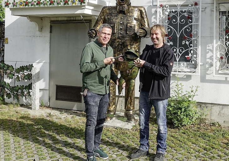 Sie werden zu runden Gebrutstagen als Skiläufer, Fußballer oder Weintrinker bestellt. Für die BAUMETALL-Reportage „Froschkönig“ in Ausgabe 6/2017 war BAUMETALL-Chefredakteur Andreas Buck persönlich vor Ort und schaute sich die Blechtiere an. Spontan orderte er einen Froschreporter mit Notizblock und Kamera, den er von Firmenleiter Ralf Jung überreicht bekam.