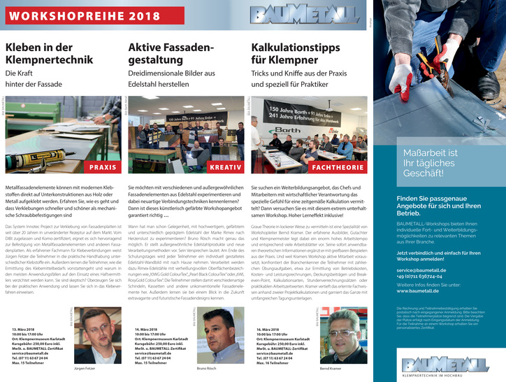 Die BAUMETALL-Workshopreihe 2018 ist gestartet! Im März gibt es kompaktes Knowhow in vier Workshops von Klebetechniken über die Gestaltung von Edelstahlfassaden bis hin zu Betriebsführung und Kalkulation. Jetzt anmelden - Platz sichern!!
