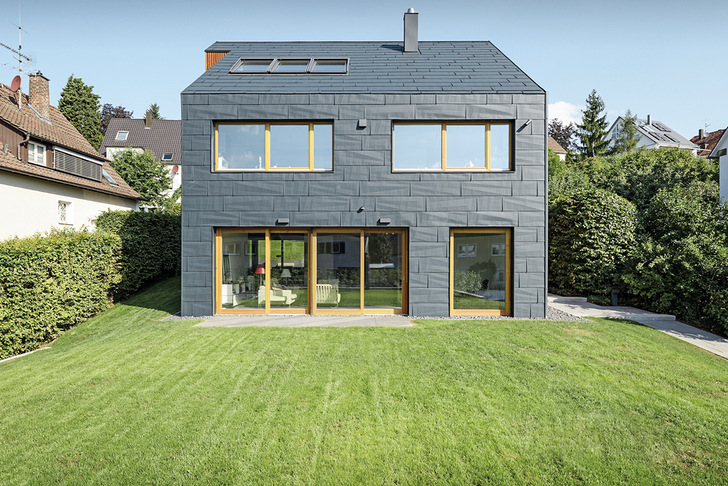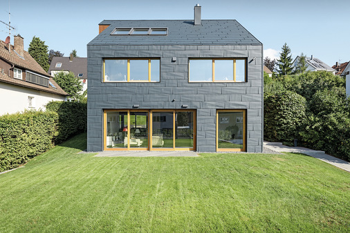 Die Architektin hatte das Material für die Bekleidung von Dach und Fassade und somit einen wichtigen Bestandteil ihres Architekturkonzeptes für das geplante Eigenheim gefunden. In weiteren Besprechungen wurden Regeldetails für die Unterkonstruktion, die Dachränder, die Entwässerung und vieles mehr festgelegt. Bei der Farbauswahl konnte sich anthrazit P.10 gegenüber dem optisch leichteren Hellgrau durchsetzen.