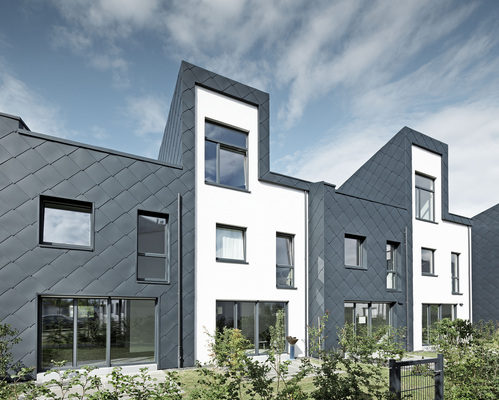Im Fassadenbereich sollte eine größere Wandraute als die Prefa-Wandraute 29 x 29 verarbeitet werden. Den entscheidenden Vorschlag machte die Berliner Bauklempnerei Ness, indem sie aus Prefa-Vormaterial eine Wandraute in den Maßen 56 x 56 cm fertigte – und damit den Zuschlag erhielt. Die Häuser erhalten zwei mögliche Fassadenarten: Entweder werden silberfarbene oder anthrazitfarbene Aluminiumgroßrauten, beide mit glatter Oberfläche, in Kombination mit hell verputzten WDVS ausgeführt. Verschiedene Dachformen, Aufbauten und Ausbauoptionen tragen zusätzlich zur individuellen Gestaltung der verschiedenen Haustypen bei.