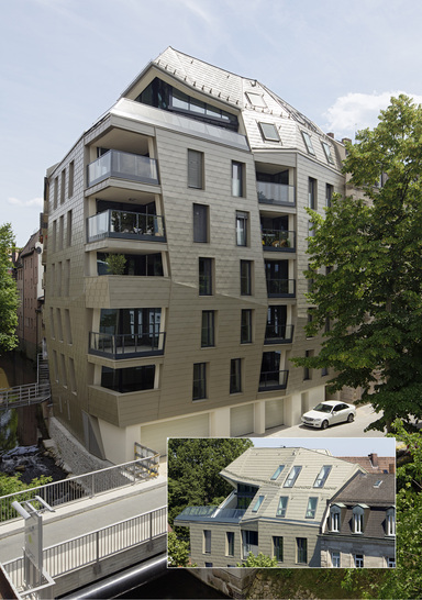 Die Wahl fiel auf ein Material der Marke Prefa mit dem Farbton Bronze. Das Rechteckformat und die Farbe nehmen Bezug auf die Sandsteinquader eines benachbarten denkmalgeschützten Gebäudes aus der Gründerzeit. Die Schindeln sind vom Erdgeschoss bis zum Dachfirst am Wohnhaus installiert. Die Hülle umschließt das Bauwerk wie aus einem Guss, sodass eine optisch einheitliche Fläche von etwa 770 m² entsteht. Jürgen Stifter: „Das Deckmaß unserer 1 mm starken Tafeln beträgt in der Länge 640 mm und in der Breite 330 mm.“ Hochgerechnet sind demnach über 3640 Exemplare mit weit mehr als 14 500 Falzen am Neubau zu sehen. Hinzu kamen gekürzte Profile und Sonderkonstruktionen aus Aluminium in der gleichen Farbe. Die Bauteile waren für die 50 Fensterlaibungen, den Bereich rund um die 25 Dachfenster sowie für die Anschlüsse zu den benachbarten Bauwerken und an der Brandabschottung bestimmt. Die Bekleidung korrodiert nicht, sondern widersteht lange Zeit der Witterung und behält dabei ihren Farbton.