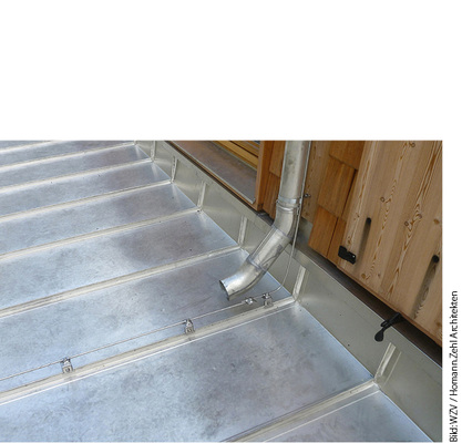 Die Höllentalangerhütte ist im Wettersteingebirge auf 1387 m Höhe ein beliebter Ausgangspunkt für Bergsteiger. Ihr flach geneigtes Pultdach ist ebenso wie der gesamte übrige Baukörper so konzipiert, dass Lawinen eine möglichst geringe Angriffsfläche haben. Die Herausforderung bei der Tragwerkplanung bestand darin, mit möglichst wenig Material Schneelasten von bis zu 10,5 kN/m² standzuhalten. Auf die wärmegedämmte, hinterlüftete Holzunterkonstruktion des Dachs mit 30 mm dicker Schalung und zweilagiger Abdichtung wurde deshalb eine 600 m 2 große Doppelstehfalzdeckung aus Edelstahl aufgebracht. Auch für die Fenster- und Sockelanschlussbleche wählten die Architekten diesen Werkstoff.