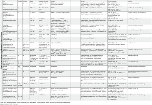 Früh übt sich, wer ein Meister werden will. Diese Redewendung ist aktuell wie nie. Selten war das Interesse am Meisterbrief so hoch und das Angebot entsprechender Vorbereitungskurse so groß wie zur Zeit. Während Bayern und Baden-Württemberg die renommiertesten Bildungseinrichtungen stellen und Spenglermeister an mehreren Standorten ausbilden, entdecken Gesellen in anderen Regionen kaum Schulungszentren. Im Norden haben Klempnergesellen allein in Hamburg und Lübeck die Möglichkeit, den Meistertitel zu erwerben. Manche Kursangebote starten nur mit einer Mindest- oder Höchstzahl an Teilnehmern, was zur Absage eines Lehrgangs oder zu einer Warteliste führen kann.