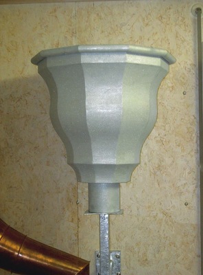 Auch der aus dem fränkischen Windsbach stammende Martin Schwarz er- arbeitete sich seinen Meisterbrief in der fränkischen „Meisterschmiede“. Als Meisterstück fertigte er einen Wasserfangkasten aus 1 mm starkem Titanzink. Hochpräzise bereitete er die einzelnen Segmente zur stumpfen Weichlot-Verbindung durch eine sogenannte Tropfenlötnaht vor. Den einfach gefalzten Kastenboden hat der ehemalige Meisterschüler ebenfalls durch eine Lötnaht abgedichtet. Auch den Stutzen zum Anschluss an das Regenrohr falzte er im Kastenboden ein. Konvex und konkav geschwungen enden die Segmente des Wasserfangkastens mit einem Wulst-Durchmesser von 22 mm. Das sich nach oben öffnende, regelmäßige Zehneck vermittelt durch die sandgestrahlte Titanzink-Oberfläche besondere Exklusivität.