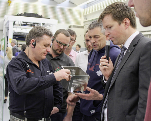 Besonderes Interesse weckte die als Laserauftragsschweißen (Laser Metal Fusion) bezeichnete Zukunftstechnologie. Das Verfahren wird auch als „metallischer 3D-Druck“ bezeichnet. Dabei baut ein Laser das Werkstück Schicht um Schicht aus einem Metallpulverbett heraus auf. Den Bauplan liefert ein CAD-Modell. Werkzeug wird nicht benötigt. Das Metallpulver wird auf eine Bauplattform aufgetragen. Der Laserstrahl schmilzt das Pulver gemäß CAD-Daten punktgenau auf und verbindet definierte Stellen mit der darunterliegenden Schicht. Diesen Vorgang wiederholt der Laser so lange, bis das Metallteil fertig ist. Das Werkstück besitzt die Eigenschaften des in Pulverform eingesetzten Materials. Nutzbar ist eine große Zahl metallischer Materialien in Pulverform, wie z. B. Stahl, Aluminium oder Titan.