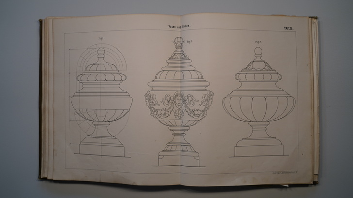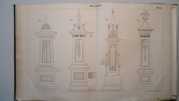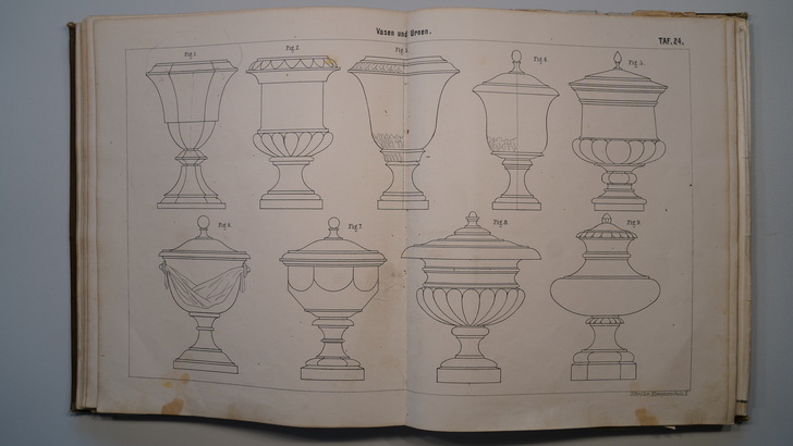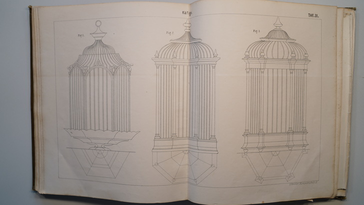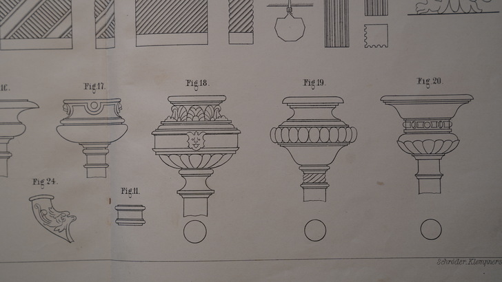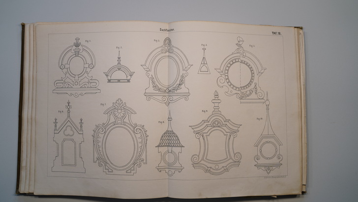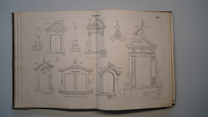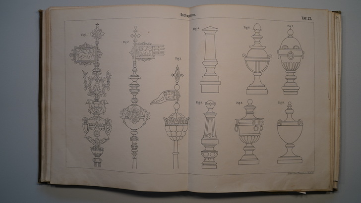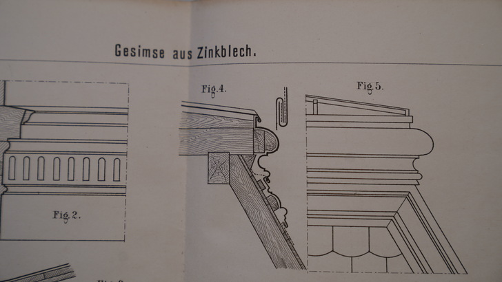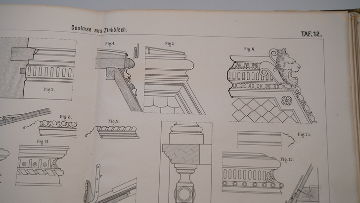 Die zwei Bildbände aus dem Jahr 1896 enthalten auf 26 bzw. 32 doppelseitige Tafeln um die 400 Darstellungen von Gesimsen, Dachrinnen, Ablaufrohren, Ablaufspeiern, Rinnenkesseln, Brüstungen und Balustraden, reich verzierten Dachfenstern sowie Windfahnen, Dachspitzen, Vasen, Ampeln, Urnen, Wetterhäuschen, Firmenschilder und Laternen.