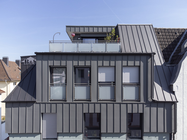 Und über all dem thront heute also noch ein vollkommen neues Obergeschoss, in dem man wohl wirklich ein echtes Gefühl von Freiheit haben kann. Dieses heutige Dachgeschoss, das über eine an drei Seiten umlaufende Dachterrasse verfügt, bekam nun selbst ein Flachdach aus Falzband. Dieses Bauprojekt führt vor Augen, welche Lösungen man für alte Dächer auf alten Häusern konzipieren und bauen kann.