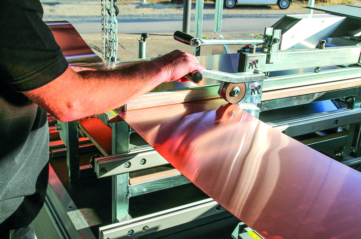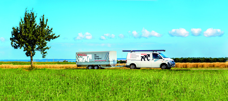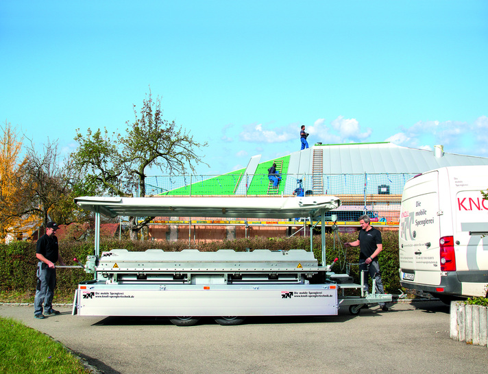 Wie zeitgenössisches fahrendes Handwerk aussieht, zeigt die Firma Knoll aus Hüttisheim. Schon 1983 konstruierten die Entwickler der Knoll Metall- und Spenglertechnik eine neuartige Alu-Abkantmaschine, montierten sie auf einen Anhänger und installierten parallel dazu einen Schneidetisch sowie umfangreiches Zubehör. Seitdem wird die Idee der mobilen Spenglerei, die sich auf unzähligen Bautellen bewährt hat, kontinuierlich weiterentwickelt. Da teure Extrafahrten zwischen Betrieb und Einsatzort entfallen, spart der Betrieb Zeit und Geld. Die mobile Spenglerei der Firma Knoll sowie ein Projekt, bei dem diese zum Einsatz kam, stellen wir in BAUMETALL-Ausgabe 7/2018 auf den Seiten 18 in der Reportage "Wenn Klempner zaubern" bzw. 20 im Bericht "Auf Achse" vor. Ergänzende Eindrücke finden Sie hier in unserer Bildergalerie:
