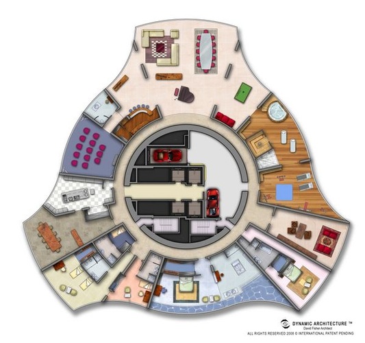 Der rotierende Wolkenkratzer besteht aus vorgefertigten Einheiten, die auf der Baustelle zusammengebaut und auf einen zentralen Betonkern gehakt werden. Jeder Stock rotiert eigenständig und verändert in jeder Sekunde das Aussehen des Gebäudes. Daher können Sie morgens mit dem Sonnenaufgang in Ihrem Schlafzimmer aufwachen und abends beim Abendessen den Sonnenuntergang bewundern. Sie können Ihren Balkon dem Ausblick und der Sonne anpassen.... und ein Teil der Natur werden...