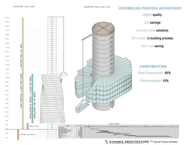 Vorfertigung – eine neue Philosophie der Immobilie Der Rotierende Turm ist das erste Gebäude, das in einer Fabrik gefertigt wurde, und bietet alle Vorteile eines industriellen Produkts, spart Energie, verringert die Bauzeit und spart Kosten.