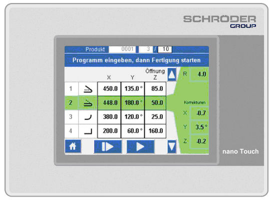 Um die Programmierung von Schenkbiegemaschinen für Klempner möglichst einfach und intuitiv zu gestalten, hat Schröder Maschinenbau die Steuerungssoftware nano Touch entwickelt. Sie ist Standardausrüstung bei allen Schwenkbiegemaschinen für Werkstatt und kleinere Industriebetriebe, so auch für die PowerBend Universal. nano Touch steuert Oberwange und Biegewange mit einem Wegmesssystem und darüber hinaus den motorischen Hinteranschlag über digital gesteuerte Frequenzumrichter.