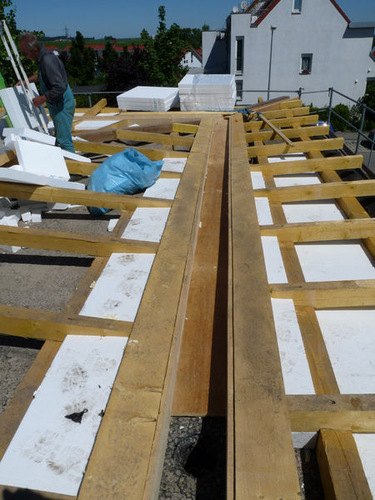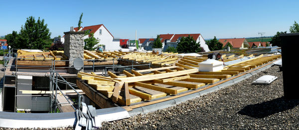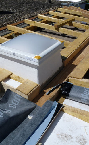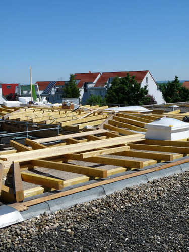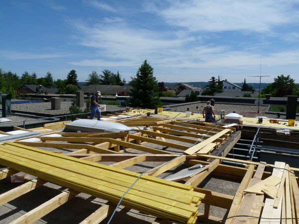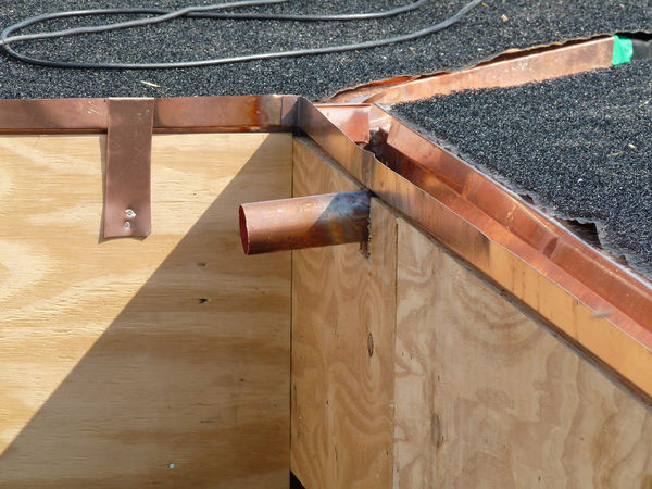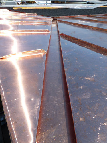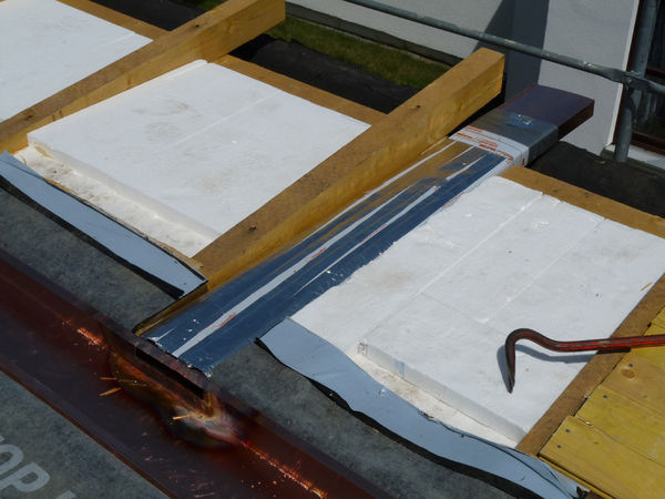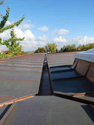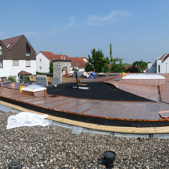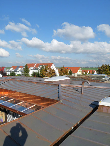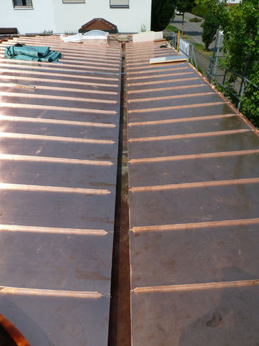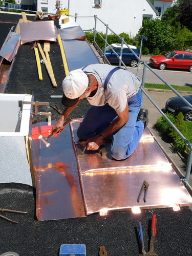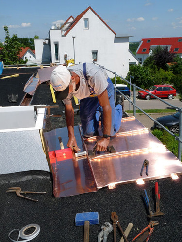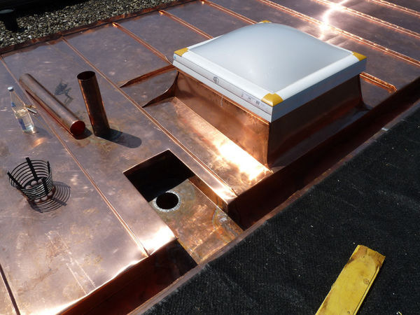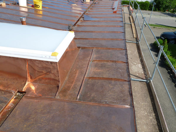 zahlreiche Kupferscharen an Oberlicht-, Sanitärlüfter- und Schornstein-Durchdringungen angeschlossen. Zudem war eine Anpassung der Scharen an diverse Zuleitungen, etwa zur Solaranlage, vonnöten.