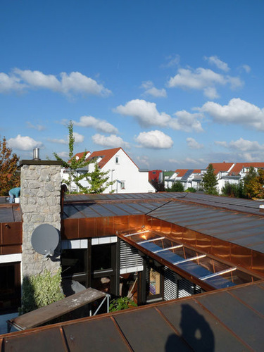 der Kupferelemente an das teilweise glasbedeckte Terrassendach!