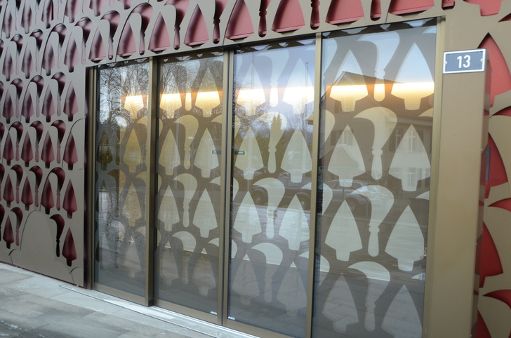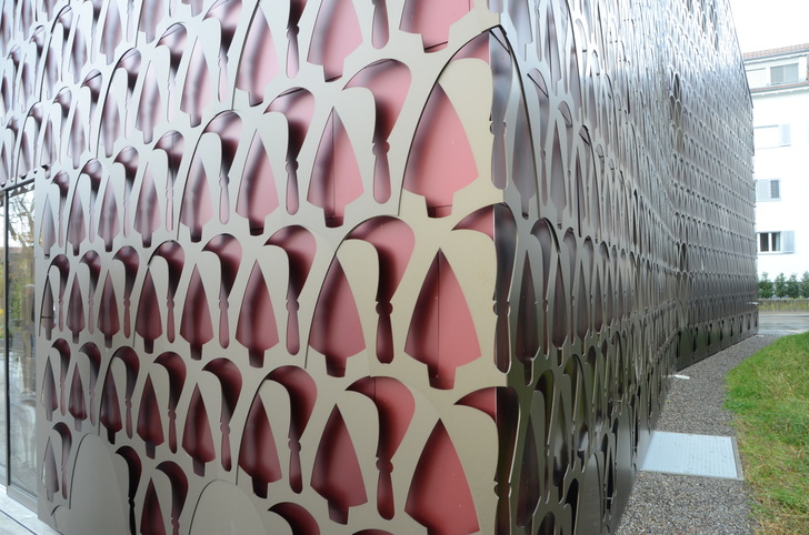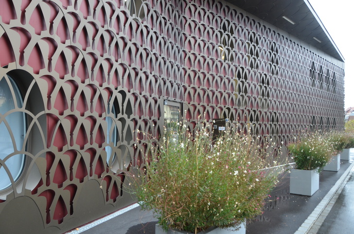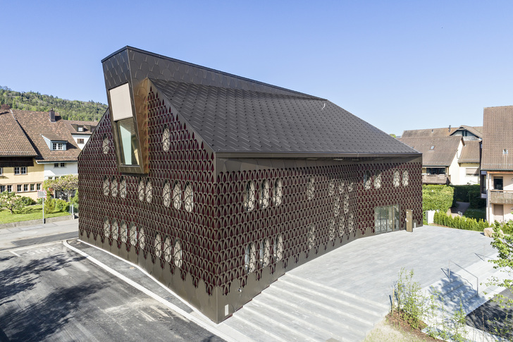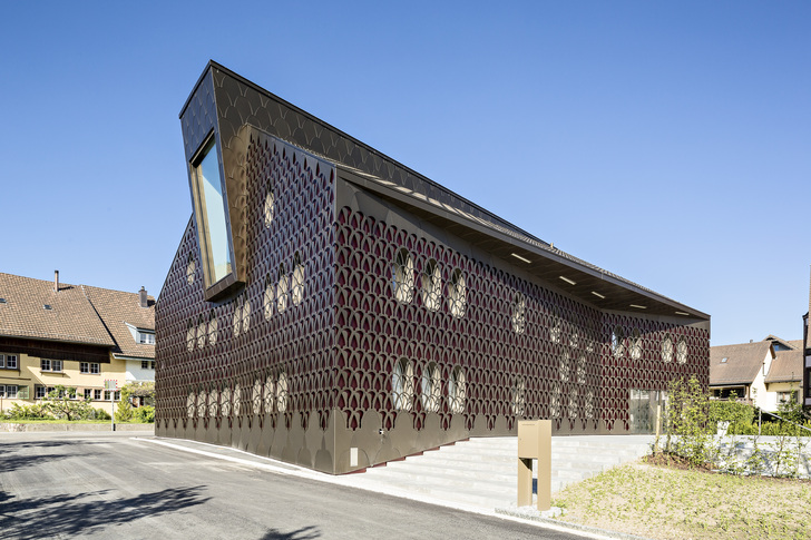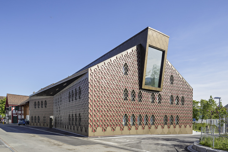 Der vom Architekten-Team Tilla Theus und Partner AG (Zürich) geplante Baukörper besticht durch eine Aluminium-Hülle, die sich wie ein Spitzenkleid um den markanten Baukörper schmiegt. Durch die schimmernden Maschen der filigranen Fassade blitzt die rote Haut, dazwischen sind die ovalen Schatten der Fenster zu erkennen. Seit 2017 prägt das aufsehenerregende Gebäude den historischen Dorfkern von Unterengstringen in der Schweiz.