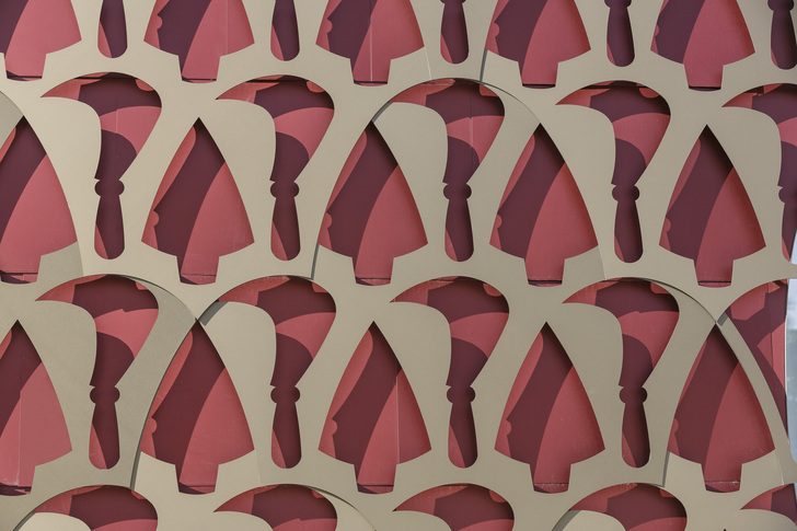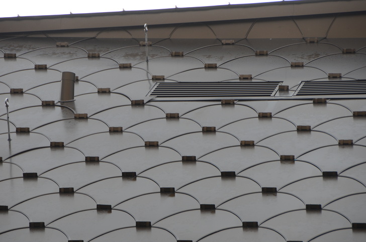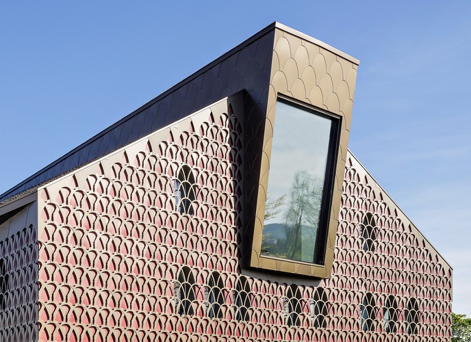 Anspruchsvoll sind bei Sonderanfertigungen auch die Details. Insbesondere die Eckkonstruktion musste haargenau zusammenpassen, ungeachtet der sonst üblichen Bautoleranzen. Die Dachkonstruktion stellt wie gesagt noch höhere Anforderungen an Material und Genauigkeit als die übrige Gebäudehülle. Wurden die geschlossenen Flächen an der Fassade auf ein Minimum reduziert, galt für das Dach das Gegenteil: Die Fläche muss dort absolut dicht und geschlossen sein und musste dennoch die hohen ästhetischen Ansprüche erfüllen und das Gebäude optisch umfließen. Die Firma prüfte deshalb diverse Metalle und entschied sich dann für farbeloxiertes Aluminium, ein leichtes, dauerhaftes und unterhaltsfreies Material. Die Formen von Pflugschar und Rebmesser wurden aus den Metallschindeln gestanzt. Scherrer Metec übernahm auch die heikle Aufgabe der millimetergenauen Montage. Die Spezialisten fixierten die Schindeln auf der darunterliegenden Fassadenebene aus rot eloxiertem Aluminium. Die Befestigung erfolgte punktuell und unsichtbar – ein ausdrücklicher Wunsch der Architektin.