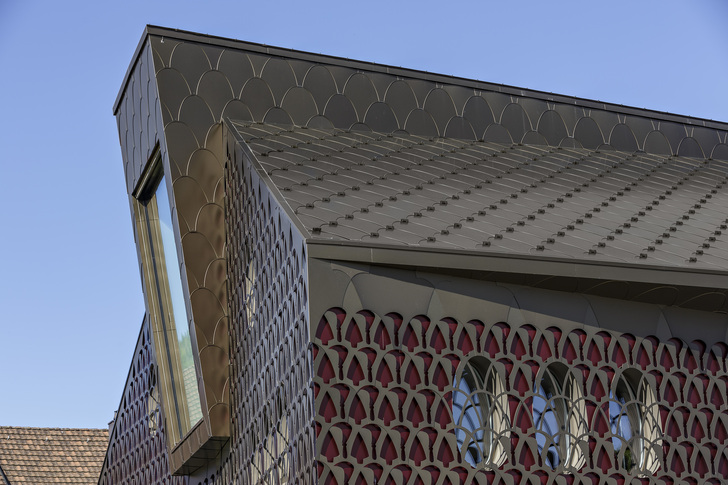 Wie es sich gehört, müssen die Kleidungsstücke zusammenpassen. So hört das Spitzenkleid bei dem Vordach optisch nicht wirklich auf. Eine speziell hierfür erstellte Raute, mit Rundungen wie das gestanzte Bild der Fassade, deckt die Fläche von der Dachkante bis zum Dachknick und steigt dann senkrecht bis zum herauskragenden, zentralen Dachaufbau, der vorne im attraktiven, großen Fenster des dahinterliegenden Gemeinderatszimmer mündet. Diese Rauten, auch eine Neuentwicklung, sind allseits rund gestanzt. Sie sind vorne rund und um etwa 5 mm angereift. Diese Erhöhung sorgt dafür, dass die Platte trotz Dünnhaftigkeit plan liegt, der Abstand verhindert einen möglichen Regenwassereinzug durch Kapillare, und die Raute liegt trotz anspruchsvoller Form schön auf. Im Bereich des geneigten Daches wurden am vorderen Spitz der Rauten direkt ein Abbug mit Schnee-Stopper-Funktion angebracht. Schließlich wurden die Platten dort, von Auge kaum wahrnehmbar, noch je zwei Briden zur mechanischen Stärkung verlegt und unter die Platten unsichtbar befestigt. Die gleichen Rauten steigen dann auf die obere senkrechte Wand. Natürlich gehen die Formbilder ohne jegliche Trennung oder Spalt über die Kante hinweg.