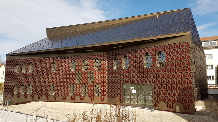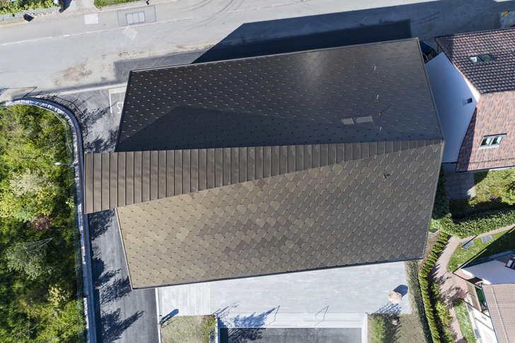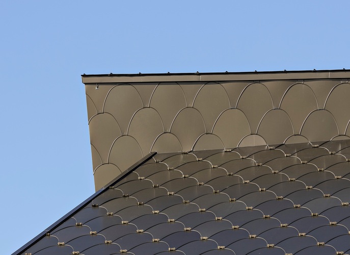 Die Uniformität dank perfekter Einteilung und Bemaßung, die Präzision, das Ineinanderfließen der Rundungen, die geschickt integrierten Fenster und Fensterrahmen, das perfekte Auslaufen in den Gebäudekanten, der diskret geführte Blitzschutz, die heiklen Befestigungen, die Dichtheit der Fassade trotz markanter Öffnungen, die Formgebung, die Konturen von Baukörper und Dachdeckung sind perfekt orchestriert und umgesetzt. Ein Hülle der Superlative, ein Bauwerk, auf das die Gemeinde stolz sein kann.