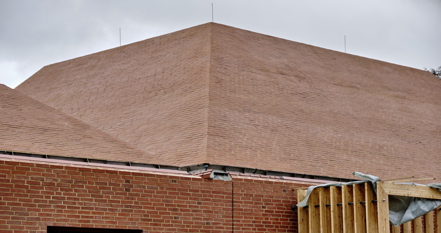 In der Tat haben Bauherr, Architekt, die ausführenden Handwerker und die beteiligten Partner aus der Industrie eine Besonderheit geschaffen: Denn erstmals überhaupt wurde bei einem Hochbauprojekt das Konzept der gebundenen Systembauweise aus dem Garten- und Landschaftsbau angewandt. Allerdings nicht im Garten oder auf der Zuwegung, sondern ganz woanders – auf dem Dach. Dort sind keine Dachziegel verbaut, sondern klassische Klinkersteine, die im halben Steinformat als so genannte Sparverblender im Mörtelbett verlegt wurden. Die insgesamt sieben Gebäude wirken dadurch wie monolithische Baukörper, denn es gibt keine sichtbaren Dachrinnen und an der Fassade wurde derselbe Klinker wie auf dem Dach verwendet. Beides in Anlehnung an die Kirche St. Konrad, die vor über 70 Jahren von Gottfried Böhm, dem Vater von Paul Böhm, erbaut wurde, längst ein Denkmal ist und schon von weitem die Umgebung prägt.