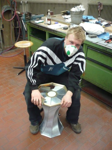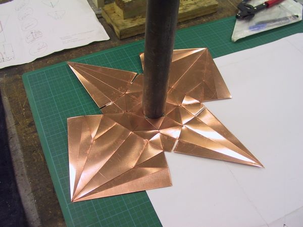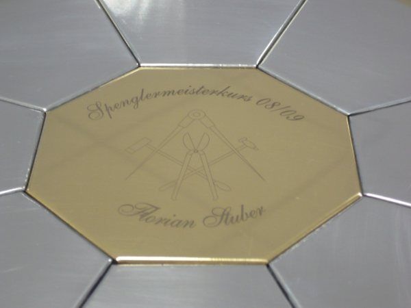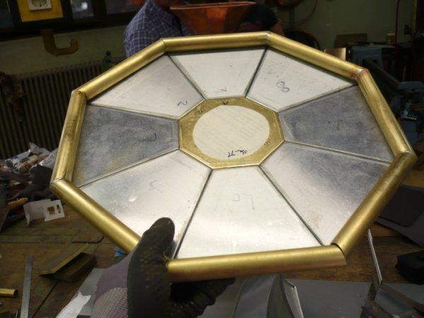 Kuppelkonstruktion bestehend aus acht Messingrohren M8. Der Kuppel besteht aus acht gerundeten Messingrohren die mit dem Plateauboden verschraubt werden. In der Spitze wird die Rohrkonstruktion durch einem achteckigen gefrästen Stern mit Einzapfung miteinander verbunden.
