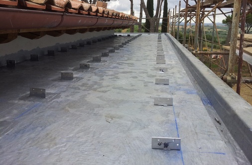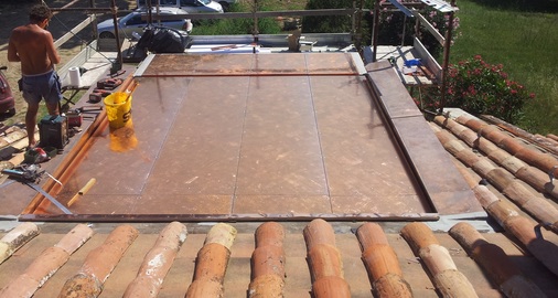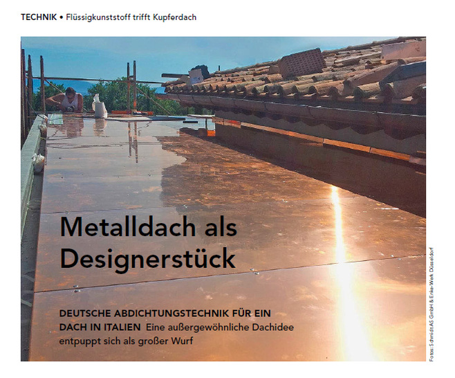 Das glatte und verspannungsfrei montierte Kupferdach entspricht den Anforderungen des Bauherrn in allen Punkten. Neben einem sehr hohen ästhetischen Anspruch erfüllt es auch den Wunsch an die uneingeschränkte Begehbarkeit perfekt. Diese Eigenschaft kommt vor allem dann zum Tragen, wenn das höher gelegene Tonziegel-Dach gewartet werden muss. Der genau aufeinander abgestimmte Einsatz moderner Baustoffe hat sich inzwischen bestens bewährt. Erste winterliche Stürme und toskanischer Dauerregen hat das Dach ebenso sicher überstanden, wie die sommerliche Hitzewelle. Spenglermeister Walther Schmidt ist zufrieden: „Obwohl der Beruf des Spenglers sehr traditionsreich ist, verschließen wir uns nicht vor dem Einsatz moderner Baustoffe. Eventuelle Berührungsängste oder Unsicherheiten können Dank professioneller Fachberatung aus dem Wege geräumt werden. In diesem speziellen Fall leisteten die technischen Außendienstberater des Düsseldorfer Enke-Werkes und der KME aus Osnabrück hervorragende Unterstützung. Gemeinsam gelang es uns, unserem Kunden eine speziell auf seine Wünsche zugeschnittene, technische Lösung anzubieten.“
