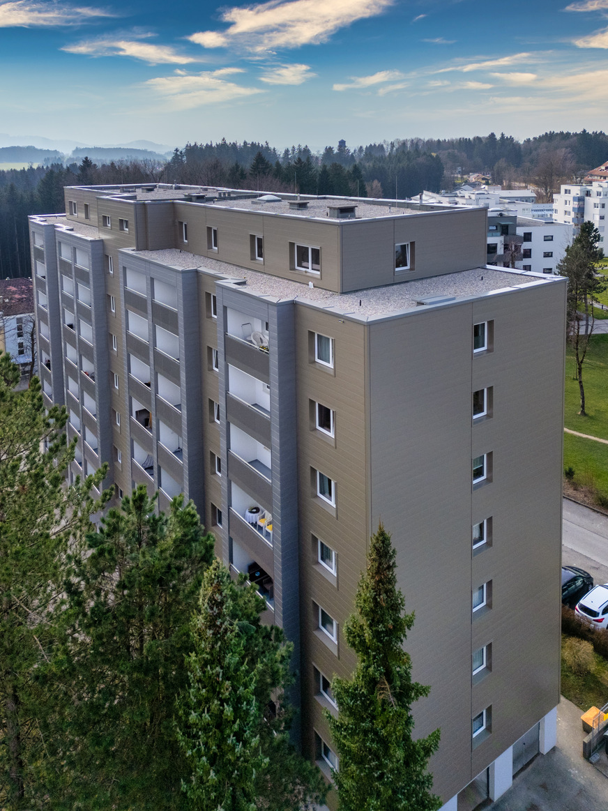 Mit Systemhersteller Domico und der Schmid Dachbau GmbH als Fachunternehmen fand die Wohngesellschaft letztendliche ihre Partner für die bestmögliche und wirtschaftliche Umsetzung einer sicheren, sparsamen und langlebigen Gebäudehülle. Die Entscheidung der GSG fiel zugunsten einer hinterlüfteten, mit 160 mm Steinwolle wärmegedämmten Metallfassadenkonstruktion des Systems Planum von Domico mit zusätzlichen Brandschotten. Damit wurden nicht nur die erhöhten Anforderungen an den Brandschutz gemäß der geltenden OIB-Richtlinie erfüllt. Ebenso konnten hiermit die ökologischen und architektonischen Ansprüche der Gemeinnützigen Siedlungsgesellschaft berücksichtigt werden. Die neue Planum-Fassade besteht aus horizontal verlegten, in Bronze sowie in RAL 9007 Grau beschichteten 1,0 mm dicken Aluminiumprofilen mit einer Deckbreite von 300 mm. Die Farbkombination beruhigt und „veredelt“ das Erscheinungsbild der vormals grellbunt gestalteten Außenhülle des Mehrparteien-Wohnhauses.