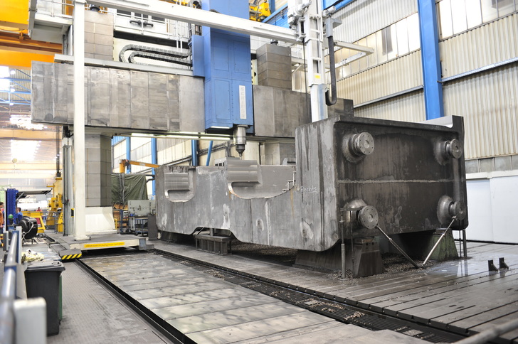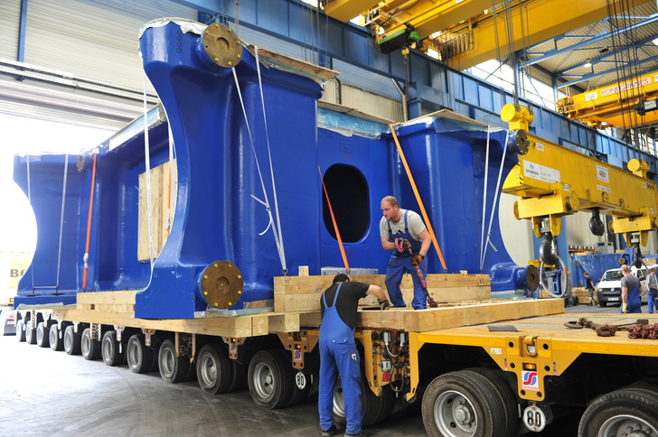 Presskraft von 6.250 Tonnen. Um die 50.000 Tonnen möglichst gleichmäßig auf ein Kundenwerkzeug einwirken zu lassen, sind vier Rückzugszylinder erforderlich, die den Laufholm millimetergenau positionieren. Pro Pressgang formt die 500-Meganewton-Nanshan-Presse von den großen Strukturteilen jeweils nur ein Teil. Zur Fertigung kleinerer Teile wie Turbinenscheiben verfügt sie zusätzlich über einen internen und externen Ausstoßer. Per FEM berechnete Druckverteilplatten gewährleisten, dass die vorgegebenen Verformungstoleranzen eingehalten werden. Alle Druckverteilplatten und der Werkstückausstoßer für Strukturteile, der sogenannte Line-Injector, wurden aus Grobblechen in der Stahlgüte S355JR+N von der Dillinger Hütte gefertigt. Sie war für Siempelkamp Partner der Wahl, galt es doch über 500 Millimeter dicke Grobbleche mit anspruchsvollen mechanischen Eigenschaften zu fertigen und in einem sehr engen Zeitrahmen just in time zu liefern. „Durch die langjährige Partnerschaft mit der Dillinger Hütte wissen wir, dass wir die zugesagte Qualität verlässlich geliefert bekommen“, lobt Friedhelm Wittenberg, zuständiger Einkäufer bei Siempelkamp. „Mitbewerber kommen an diese Qualität nicht ran.“ Insgesamt zwölf dieser Grobbleche kamen hier zum Einsatz – mit Rohgewichten von über 39 Tonnen. „Je dicker die Bleche sind, desto besser ist die Druckverteilung“, so Friedhelm Wittenberg. In intensivem Austausch mit der Dillinger Hütte wurden die spezifischen Anforderungen wie Fertigabmessungen, Liefertermine und -reihenfolge, mechanische Werte sowie ein eingeschränktes Kohlenstoffäquivalent festgelegt. Die Produktion von Blechen in dieser Dicke war auch für den weltweiten Qualitäts- und Technologieführer für Grobbleche eine Premiere. Um trotz der Blechdicke von 510 Millimetern analoge mechanische Eigenschaften zu gewährleisten, wie sie die EN 10025 für Blechdicken bis 400 Millimeter vorgibt, wurde sehr dickes, homogenes Vormaterial auftragsbezogen abgegossen und mit enormen Kräften auf Fertigmaß gewalzt. Entsprechend angepasste Stichpläne ermöglichten es, den Blechkern im geforderten extremen Umfang zu verformen. Dadurch konnten auch die von Siempelkamp erwarteten Ebenheitstoleranzen von 13 Millimetern auf der Gesamtfläche zuverlässig eingehalten werden. Ihre stattliche Länge von 4.080 Millimetern reichte bei einigen der für die 500-Meganewton-Presse benötigten Komponenten nicht aus, so dass jeweils drei dieser Bleche für die Druckverteilerplatten unterhalb des Laufholmes sowie für den Verschiebetisch von Siempelkamp im Elektroschlackeschweißverfahren zusammengeschweißt wurden. Nach der abschließenden Bearbeitung hatten sie ein Fertigmaß von 4.000 x 7.000 Millimetern bei 480 Millimetern Dicke. Insgesamt 40.000 Arbeitsstunden dauerte es, bis sämtliche Komponenten der Großpresse mit einem Fertiggewicht von nahezu 8.000 Tonnen berechnet, gefertigt, geprüft und verpackt waren. Transport nach China, Montage und Inbetriebnahme erfolgten ebenfalls durch die Krefelder Spezialisten. Unterm Strich eine wahrhaft große Leistung, die nur durch das perfekte Zusammenspiel der Einheiten im eigenen Unternehmen und Partner wie der Dillinger Hütte möglich wurde.
