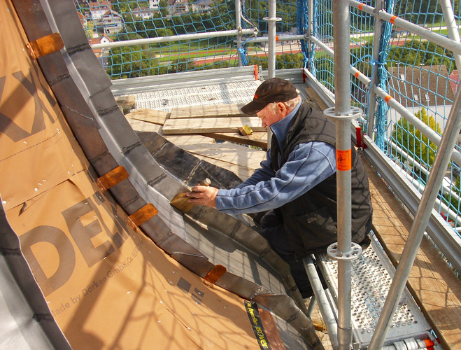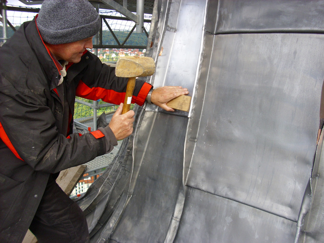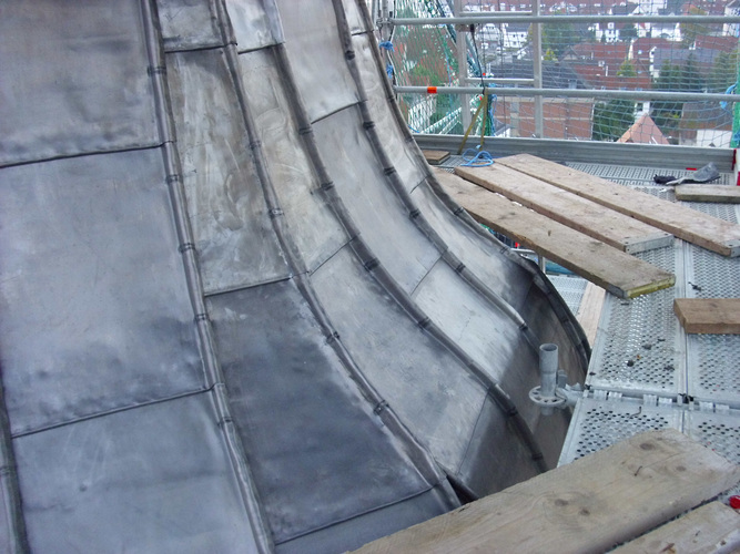 Die konvexen und konkaven Dachpartien erforderten eine zusätzliche Bearbeitung der Walzblei-Schare. Um die Aufkantungen an die konvexe Krümmung anzupassen, schnitten die Handwerker die Falzbereiche senkrecht ein. Dann setzten sie einen Bleikeil in die offene Stelle. Die zugeschnittenen Keile wurden stumpf gestoßen eingesetzt und verschweißt, damit keine zusätzlichen Materialstärken das spätere Falzen erschweren. Bei den Bleischaren für die konkaven Dachflächen gingen die Dachdecker genau spiegelbildlich vor. Sie schnitten aus den Falzen einen Bleikeil heraus und verschweißten das Material. Die Nähte wurden auch hier stumpf gestoßen und verschweißt. Die Schweißarbeiten fanden aus Brandschutzgründen nicht auf der Dachfläche, sondern am Arbeitstisch auf dem Gerüst statt.