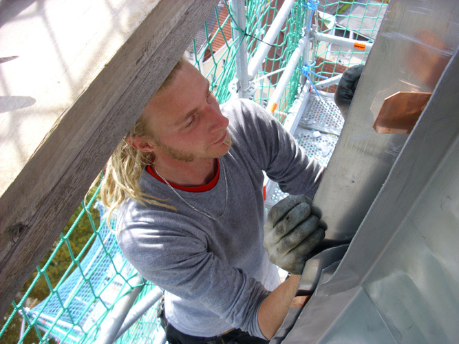 Jedes Gebäude stellt ganz eigene Anforderungen an Material und Technik. Die 112 Quadratmeter große Turmdachfläche von St. Nikolaus bot den Handwerkern einige Herausforderungen. Im unteren Bereich ist der achteckige Turmhelm konvex, also nach außen, und konkav, d.h. nach innen gekrümmt. Das Einbinden der Grate an der Dachspitze verlangt zudem ein individuelles Anfertigen der Bleischare vor Ort. Um die beteiligten Dachdecker auf die Arbeiten vorzubereiten, kam Jürgen Seifert vor Beginn der Eindeckarbeiten zu einem Beratungstermin in die Werkstatt von Werner Krolpfeifer. An einem Bleimodell schulte er die Dachdeckergesellen in den verschiedenen Verbindungstechniken. Viele der Mitarbeiter hatten bisher noch keine Bleiarbeiten in vergleichbarem Umfang ausgeführt.