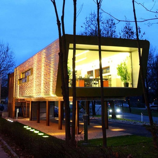Zusamen mit dem Architekturbüro Viereck in Graz und KME entstand für den Prototyp BOX09 - eine vielseitig nutzbare und schnell zu errichtende Raumzelle mit repräsentativem Charakter - Die moderne Fassadenkonstruktion besteht aus einer 3D Platte (Motiv “Wasserwelle”). Sie verleiht diesem Innovationsprojekt ein außergewöhnliches Erscheinungsbild.