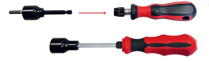 Er greift am Ösenkopf der Schraube zu und optimiert die Kraftübertragung punktgenau. Erhältlich ist der neue Ösenschraubendreher entweder mit 2K-Heft oder als ¼-Zoll-Ösenschraubendreheraufsatz zur Bohrfutteraufnahme. Letztere Version ist mit einem Haltedruckstift und Richtungslinien zur Bestimmung der genauen Ösenposition ausgestattet. Passend dazu ist ein ¼-Zoll-Handhalter erhältlich, der ebenfalls mit einem stabilen 2K-Heft versehen ist. Im Video können Sie sehen und hören(!), wie effektiv das praktische Werkzeug eingesetzt werden kann. Lassen Sie sich überraschen.
