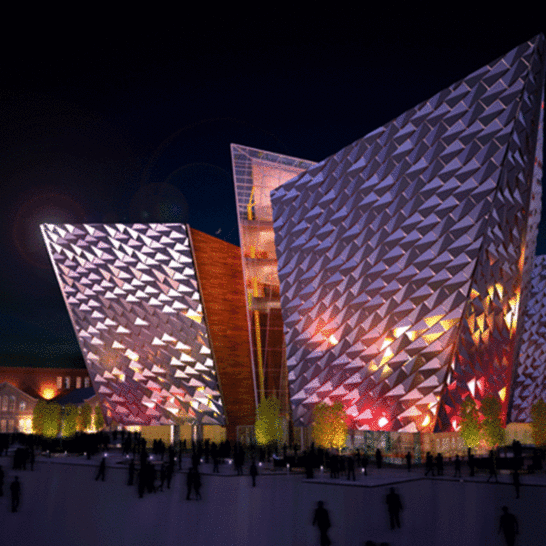 Die 3 mm starken Aluminium-Bleche wurden durch EDM Spanwall, Belfast, ein Spezialist für die Herstellung von Architekturfassaden, zu Panelen verarbeitet. Spanwall produzierte dabei eine Serie von 10 geometrischen Verkleidungsformen, die in zufälliger Art und Weise asymmetrisch angebracht wurden. Die Paneele werden darüber hinaus durch ein das Gebäude umgebende Wasserspiel mit farbigen Unterwasserlichtern betont, die sich auf der Fassade widerspiegeln.In beeindruckender Art und weise zeichnen sich die Aluminiumbauteile durch eine anspruchsvolle Geometrie, wie Winkel, Falten und Querstreifen aus, die in ihrer Form der Metallkonstruktion des Schiffbaus folgen.