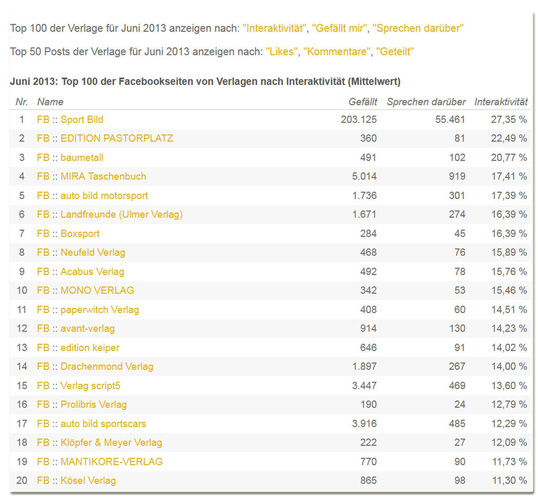Die Wertung erfolgt gemäß dem Kriterium „Interaktivität“. Zur Vergleichbarkeit wird hier eine Verhältniszahl zwischen den Likes (ehemals Fans) und der Anzahl sämtlicher Interaktivitäten mit der Seite gebildet. In diesem Sinn bedanken wir uns ganz herzlich bei Ihnen – dafür, dass Sie die Seite mit „Gefällt mir“ markiert haben sowie für jeden einzelnen Like, jeden Kommentar, jeden Klick und für jedes Teilen eines Beitrags.