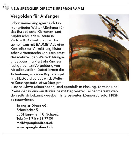 Den Start des mehrteiligen Weiterbildungsangebotes markiert ein Kurs zur fachgerechten Vergoldung von Metallbauteilen. Dabei lernen die Teilnehmer, wie eine Kupferkugel mit Blattgold belegt wird.