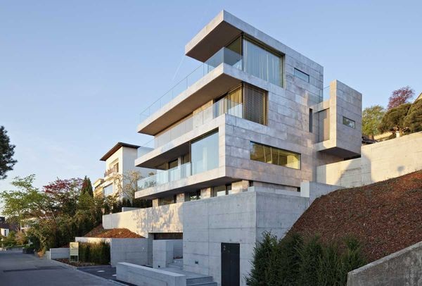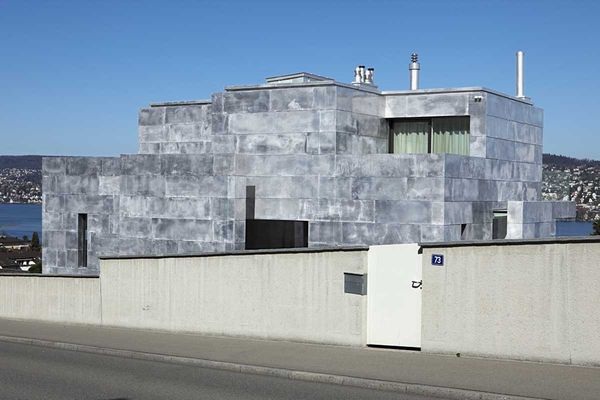 Die optische Wirkung der manuell verzinnten Paneele bleibt die einzige (kalkulierte) Zufälligkeit, denn die Planung zeichnet sich durch einen ex-trem hohen Detaillierungsgrad aus. Zahlreiche Schnittstellen wie die Ü-bergänge von horizontalen zu vertikalen Flächen, zu Fenstern, Dächern, Erkern, Installationen, Eingängen, Lüftungen, Einfassungen, Halterungen und Abdichtungen erfordern sorgfältig durchkonstruierte Lösungen. Zum Beispiel sind die Halterungen der Balkon- und Terrassenbrüstungen mit Metallprofilen und Abdichtungen im Terrassenboden eingelassen. Die Brüstungen aus Sicherheitsglas können in diese Haltungen einfach einge-hängt werden.