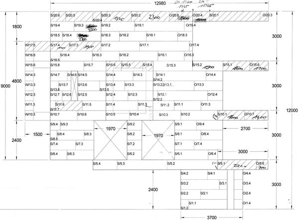 Noch während die Spengler immer neue Varianten probieren, um sie der Bauherrschaft und dem Architekten zur Begutachtung vorzulegen, beginnt die Detailplanung. Vom Architekten ist ein Grundraster von 60 x 60 cm vorgegeben. Er zieht sich horizontal wie vertikal durch die gesamte Archi-tektur und bestimmt auch die Gliederung der Fassade. Zugleich legt der Architekt grossen Wert auf ein gestaltetes Fugenbild. Für jede Fassaden-seite werden Lage und Breite jedes einzelnen Paneels genau festlegt. Was auf die Entfernung wie Mauernfugen aussieht, sind aus der Nähe be-trachtet die Falze der präzise ineinandergefügten, sich überlappenden Blechpaneele. Das Fugenbild wirkt wie aus grossen Quadern aufgebaut, wodurch das Haus hangseitig einen fast klassischen Charakter erhält und sich in die Umgebung integriert.