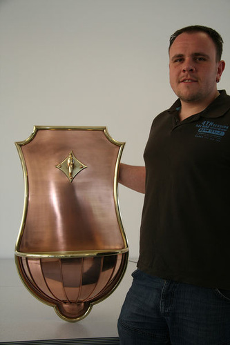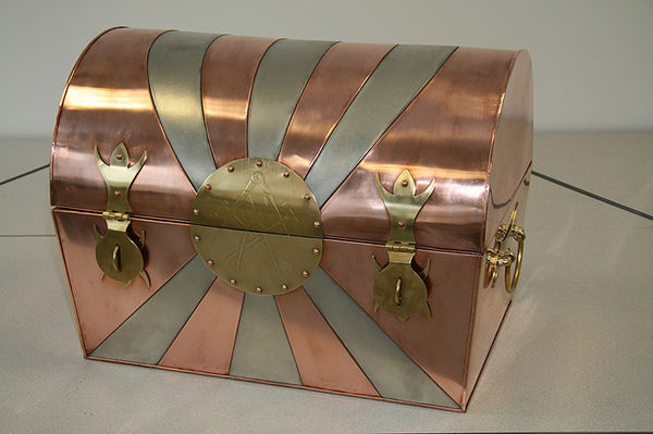 Christian Steinhard: Zunfttruhe aus Tecu-Zinn,Tecu-Walzblank und Messing mit liegend ausgeführter Verfalzung und geätztem Zunftwappen |