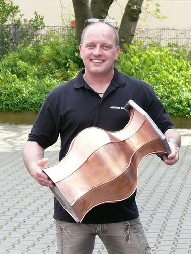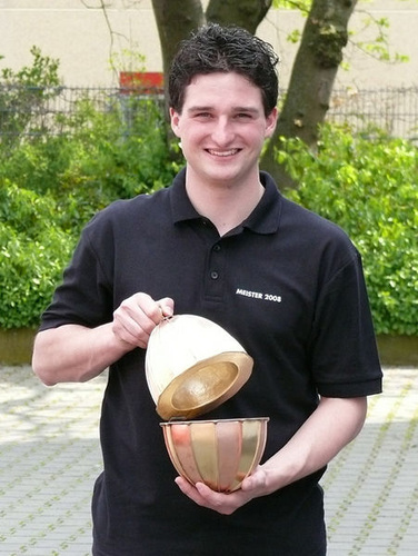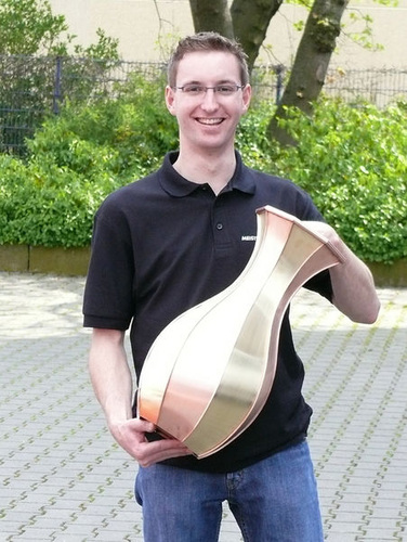 Andreas Walter: Gedrehte Bodenvase aus acht regelmäßigen Segmenten aus Kupfer und Messing. Verbunden durch Einfachstehfalze am Außenteil. Das Innenteil wurde als Übergang von achteckig auf rund hergestellt. Die Verbindung von Innen- und Außenteil erfolgte durch eingenutetes Kupferrohr |