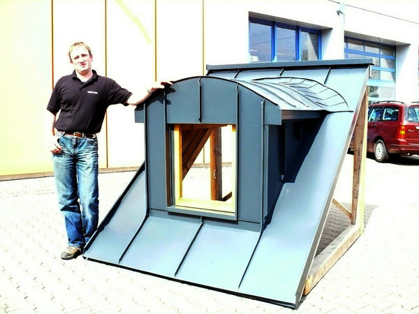 Andreas Weißmüller: Dachmodell mit gewölbter Gaupe aus Farbaluminium. Der Übergang im Kehlbereich von Gaupe und Hauptdach wurde durch eine Faltenkehle aus einem Stück hergestellt. Die Dachfläche am Hauptdach ist im Winkelstehfalzsystem, die Dachfläche der Gaupe im Doppelstehfalzsystem eingedeckt |