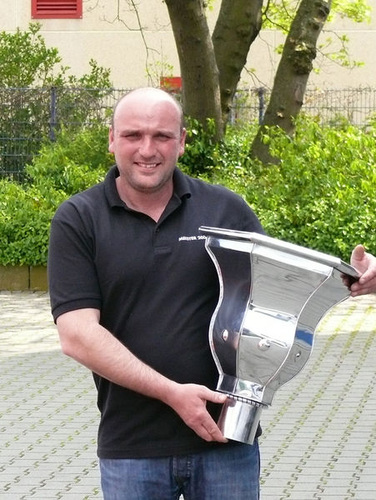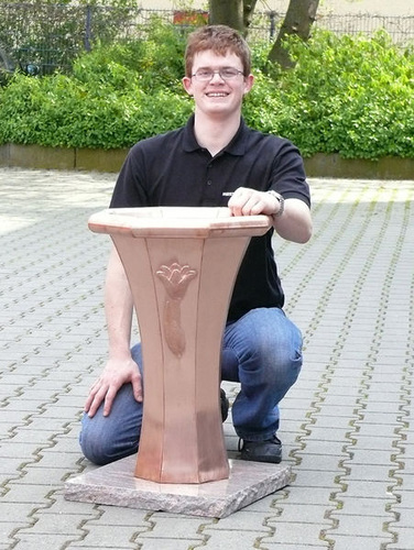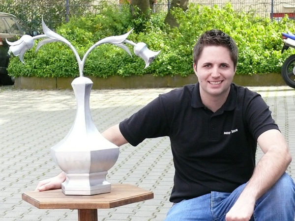 Christian Horn: Die auf Gehrung gefeilten Segmente der 8-teiligen Titanzink-Vase sind durch Tropfennaht verbunden. Die ansprechende Optik durch geschliffene Oberflächenstruktur und zwei handgefertigte Zinkblumen vervollständigen das Meisterprüfungsprojekt |