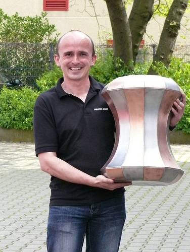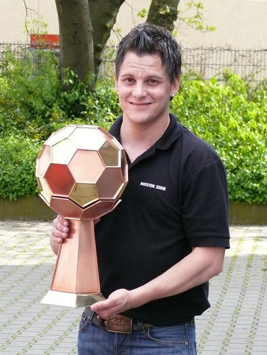 Hubert Karmann: Der Fußball in Form eines Ikosaeders, dem gleichmäßig die Ecken abgeschnitten wurden, besteht aus 12 regelmäßigen Fünfecken und 20 regelmäßigen Sechsecken, verarbeitet wurden Kupfer und Messingblech zusammengefügt durch außenliegende Einfachstehfalze |