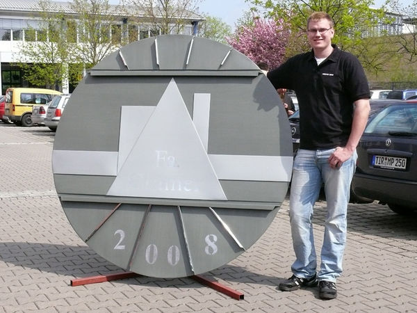 Iwer Cramer: Firmenschild aus vorbewitterten und walzblankem Titanzinkblech, montiert auf einer mit Z-Profilen umrahmten OSB-Platte, Deckscharen in Winkelstehfalztechnik strahlenförmig montiert und im Z-Profil eingefalzt, Hervorheben der Schrift durch Schleifarbeiten |