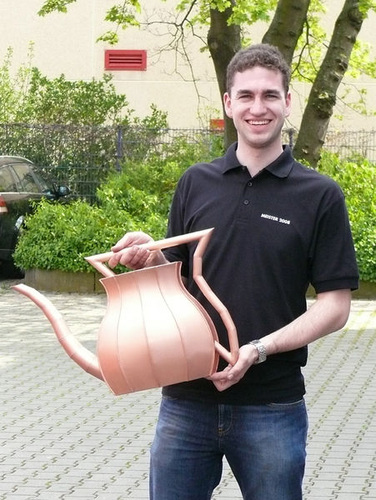 Max Pschörer: Die 10-teilige unregelmäßige Gießkanne wurde durch Einfachstehfalze nach außen am Kannenkörper verfalzt, die konischen Segmente des Ausgießers sind überlappt und von Innen weich gelötet, der zylindrisch segmentierte Griff durch WIG-Schweißnähte miteinander verbunden |