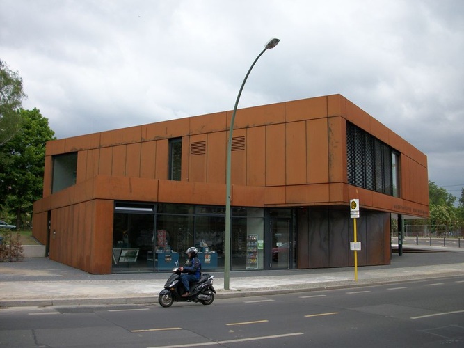 Die Außenhaut des Gebäudes bildet eine hinterlüftete Kassetten-Konstruktion aus wetterfestem Baustahl, die dem Gebäude seine prägnante Außener-scheinung verleiht. Die Wahl des wetterfesten Baustahls als Fassadenmaterial macht die Zuordnung zur Mauergedenkstätte für den Besucher auf den ersten Blick deutlich, da auch die Ausstellungskomponenten im Außenraum und Nachzeichnungen der historischen Spuren aus diesem Material gefertigt wurden. Aus diesem Grunde kommen auch im Innenraum robuste Sichtbetonoberflächen zum Einsatz. Das robuste, puristisch gestaltete Erscheinungsbild versteht sich als Fortsetzung des Außenraums.