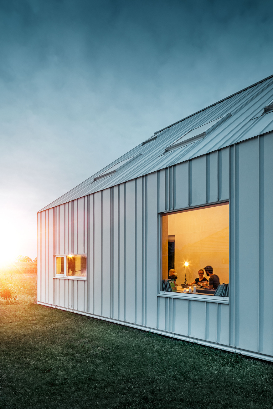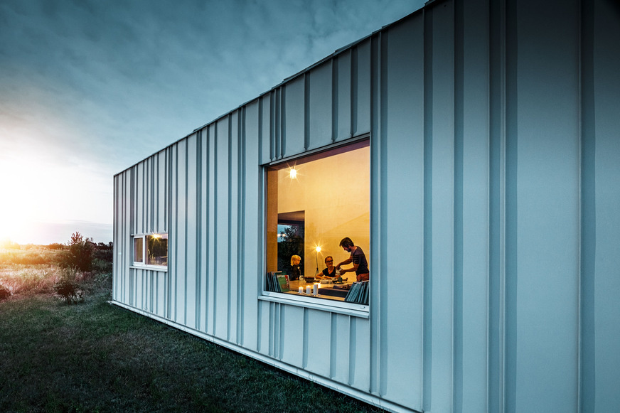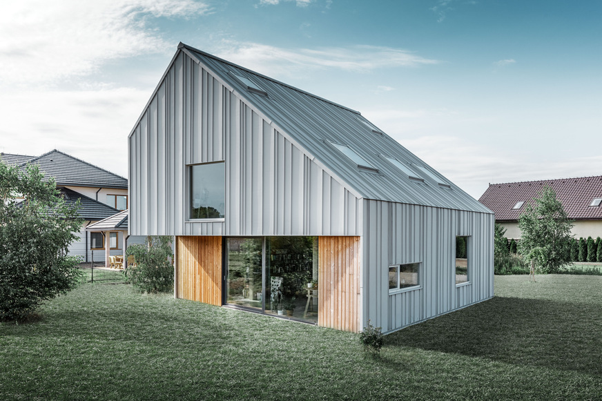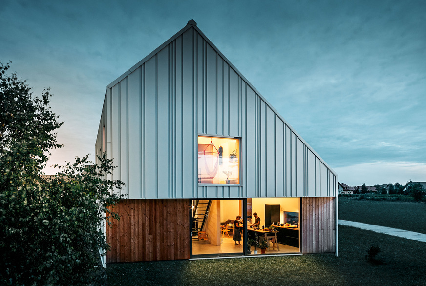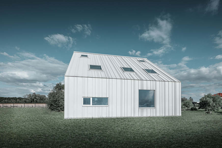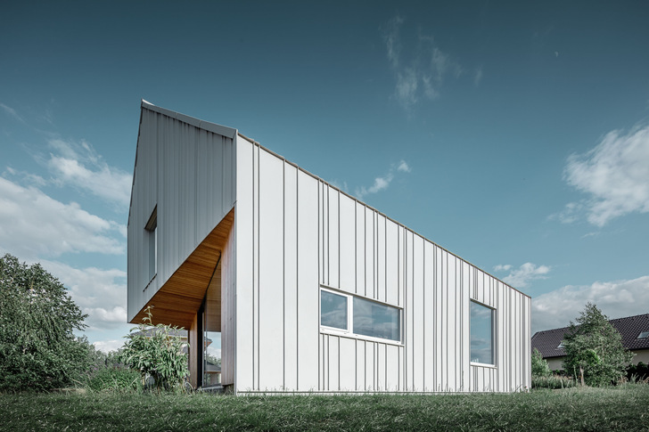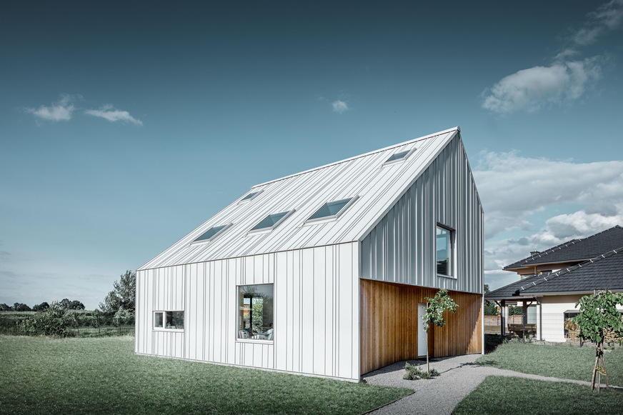 “There is nothing that serves as a point of reference,” says Grzegorz Ziebik. “There is neither anything here to rebel against nor to follow.” The Ziebik home stands out—with its large, archetypical roof, its simple forms, the Prefalz tracts which dominate the roof and façade in various widths and thus influence the house’s character. The entrance is made of wood, which slowly changes its colours. It stands in sharp contrast to the aluminium, which hardly changes at all. There are no details and no balcony. “It is the model of a house,” says Grzegorz.