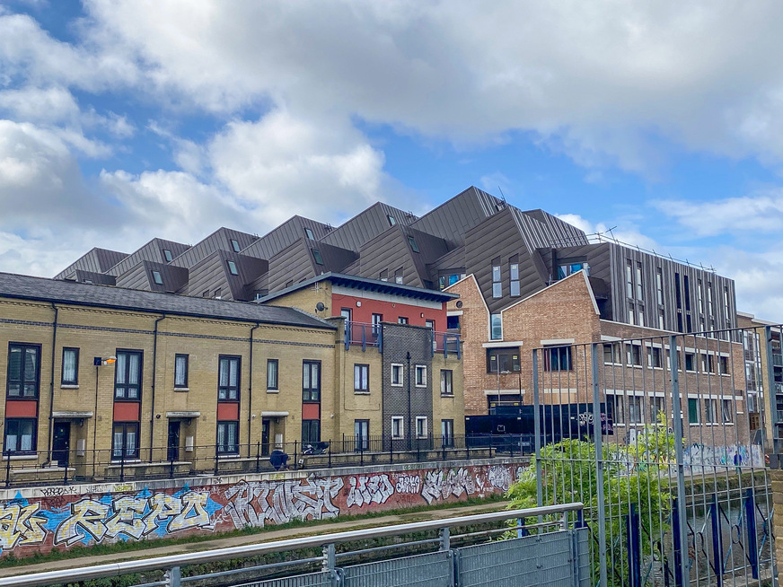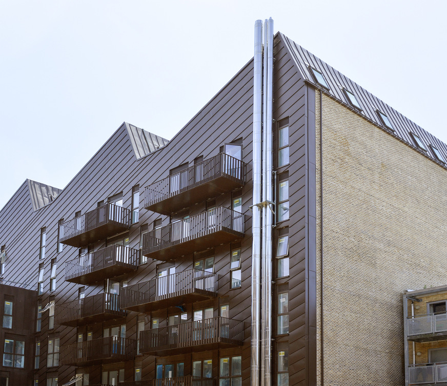 This redevelopment of a 1939 factory building and 1956 warehouse provides 115 new affordable homes of the site in the Limehouse Cut Conservation Area. Whilst the original buildings could not be retained, their appearance is echoed in the new scheme which uses A2,s1-d0 rated zinc roofing and cladding to provide additional storeys.